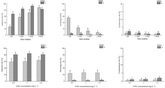 Under the -N treatment, with the increase in the concentration of the basic medium, the bud induction rates of A. auriculiformis increased first and then decreased. The bud induction rate in the 1/4MS medium was the highest, at 93.8%, and the induction rate in the MS medium was significantly lower than that in the other treatments. There were no significant differences in the browning rate or contamination rate of the different media (Figure 2).