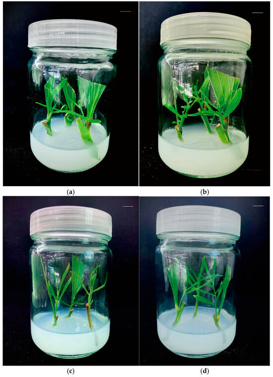 The selected new shoots of A. mangium and A. auriculiformis were soaked in washing powder dilution for 30 min and then rinsed. Then, a soft-bristled brush dipped in washing powder dilution was used to clean the surfaces of the branches. The stems with leaves were cut into 3–5 cm segments, retaining 1/3 of the original leaves and containing full axillary buds, to be used as explants. The pruned stems were rinsed with running water for more than 1 h, and then completely immersed in 0.8 g·L−1 carbendazim solution for disinfection for 3 min [31,32]. Then, the explants were rinsed with tap water, and filter paper was used to dry the surface of the explants before inoculation.