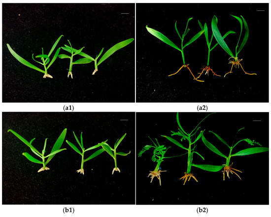 The rooting of A. mangium-induced buds. (a1) -N treatment-induced bud rooting after 15 days. (a2) -N treatment-induced bud rooting after 30 days. (b1) F treatment-induced bud rooting after 15 days. (b2) F treatment-induced bud rooting after 30 days. Scale bars (top right-hand corner in each picture) = 1 cm.