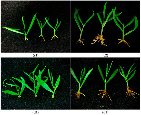 The rooting of A. auriculiformis-induced buds. (c1) -N treatment-induced bud rooting after 15 days. (c2) -N treatment-induced bud rooting after 30 days. (d1) F treatment-induced bud rooting after 15 days. (d2) F treatment-induced bud rooting after 30 days. Scale bars (top right-hand corner in each picture) = 1 cm.
