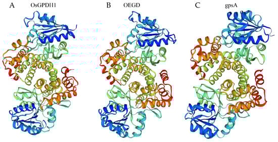 The three-dimensional structure of three proteins established by homology-based modeling. (A) Structure of OsGPDH1. (B) Structure of OEGD. (C) Structure of gpsA.