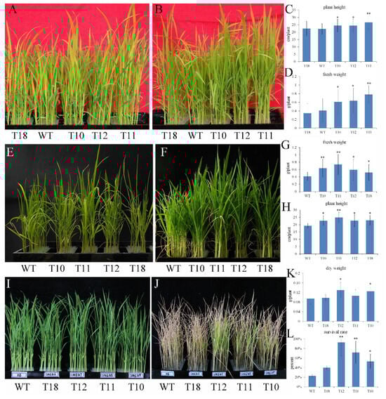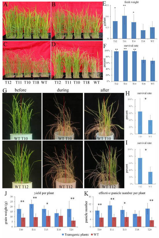To evaluate the performance of the transgenic rice plants under drought stress, the transgenic lines and WT were grown in the same pot under normal growth conditions until the three-leaf stage. Water supply was withheld to induce drought stress, resulting in complete wilting of the leaves (Figure 2G). After re-watering, the survival rates of T10 and T12 were higher than those of WT in each pot (Figure 2G). The results indicated that the overexpression of OEGD enhances tolerance to drought stress at seedling stage. In the cement pool, drought stress at tillering stage influenced subsequent plant growth. However, the effective panicle number per plant of T10, T11, and T13 was significantly higher than that of the adjacent WT plants, except for T18. Consequently, T10, T11, and T13 exhibited higher yields per plant compared to WT (Figure 2J,K). The results further indicated that overexpression of OEGD enhanced tolerance to drought stress at the adult stage.
