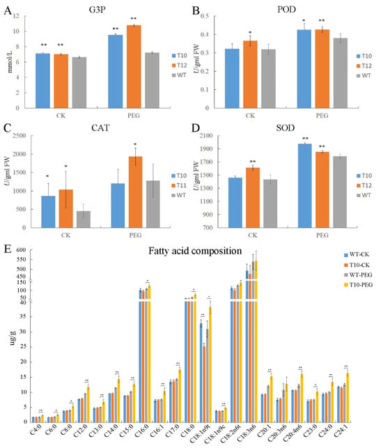 G3P, ROS level, and fatty acid assay of WT and OEGD transgenic lines. (A) G3P content in leaf after 20% PEG6000 and water treatments. (B–D) POD, CAT, and SOD activity in leaf after 20% PEG6000 and water treatments. T10 and T12 indicate transgenic OEGD lines, and WT indicates the wild type. (E) Fatty acid composition of leaf lipids after 20% PEG6000 and water treatments. The error bars indicate SEs based on three replicates. t-test was performed between OE and CK in the same color columns. *, p < 0.05 and **, p < 0.01.