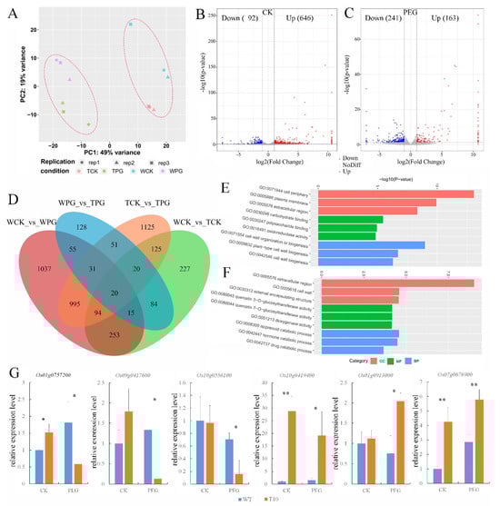 Transcriptome analysis of WT and OEGD transgenic lines. (A) Principal component analysis of total lines based on RNA resequencing data. PC, principal component. (B,C) Volcano plots showing the number of differentially expressed genes (DEGs) regulated by OEGD under normal conditions (B) and osmotic stress (C). DEGs were identified using p value < 0.05 and absolute log2-fold change > 1 as criteria. (D) Venn diagram showing the overlap between OEGD-regulated genes and gene response to osmotic stress. WPG indicates WT under PEG6000 treatment. TPG indicates OEGD transgenic lines under PEG6000 treatment. WCK indicates WT under normal conditions. TCK indicates OEGD transgenic lines under normal conditions. (E) Gene ontology (GO) enrichment analysis of DEGs in the biological process under normal conditions. (F) Gene ontology (GO) enrichment analysis of DEGs in the cellular component under osmotic stress. (G) The relative expressions of Os01g0757200, Os07g0676900, Os10g0419400, Os01g091300, and Os09g0417600 were examined in the WT and OEGD transgenic lines after PEG6000 treatment for 3 d by qPCR. Values are mean ± SD (n = 3). *, p < 0.05; **, p < 0.01 (two-sided Student’s t-test) vs. the WT under the same conditions.