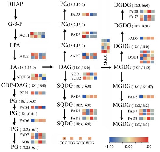 Schematic view of glycerolipid biosynthesis pathways integrated with RNA-sequencing data. To visualize the relative transcript levels between the transgenic plants and the wild-type control, gene-expression data were mapped the pathway diagrams complied from OryzaCyc and Ref. Shen et al., 2010 [20]. Different lipid species (sn-1/sn-2, C18:C18, or C16:C16) are derived either from the endoplasmic reticulum pathway or from the chloroplast pathway. DAG, diacylglycerol; MGDG, monogalactosyldiacylglycerol; DGDG, digalactosyldiacylglycerol; DHAP, dihydroxyacetone phosphate; PA, phosphatidic acid; CDP-DAG, cytidine diphosphate diacylglycerol; PC, phosphatidylcholine; SQDG, sulphoquinovosyl diacylglycerol. WPG indicates WT under PEG6000 treatment. TPG indicates OEGD transgenic lines under PEG6000 treatment. WCK indicates WT under normal conditions. TCK indicates OEGD transgenic lines under normal conditions. The color blocks represent an interactive heatmap visualization of log2-transformed relative gene expression levels, sequentially arranged from left to right as TCK, TPG, WCK, and WPG.