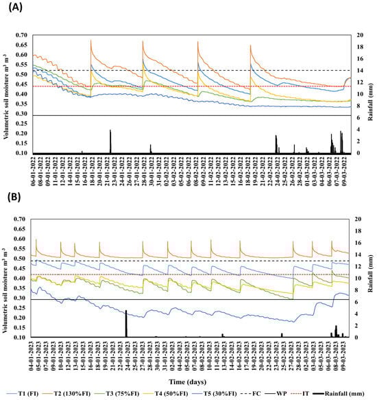 Temporal dynamics of soil volumetric water content (m3 m−3) and daily rainfall (R, mm) during the 2021/2022 (A) and 2022/2023 (B) seasons. Irrigation treatments (T) were T1 = 100 % of crop evapotranspiration replacement (full irrigation), T2 = 130 %, T3 = 75 %, T4 = 50 %, and T5 = 30 % of T1. The red dashed line marks the irrigation threshold (IT), while the two black lines indicate soil water content at field capacity (FC, dashed line) and permanent wilting point (WP, solid line), respectively. Vertical bars represent measured precipitation.