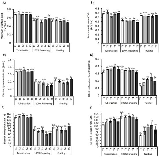 Similarly, ETR showed significant differences between treatments and the interaction between factors and the phenological stage (p < 0.001). During tuberization in the 2021/2022 season, the T3 treatment presented the highest values, as did the T3 and T4 treatments in the 2022/2023 season (Figure 2E,F), with an average of 158.08 and 127.84 µmol e−1 m−2 s−1. During the flowering stage of the 2021/2022 season, a reduction was observed in all regimes, accentuated in the T4 and T5 treatments by 58% and 56%, respectively. Meanwhile, in the 2022/2023 season (Figure 2F), an increase in ETR was observed in all treatments during flowering, where, as in the previous season, T5 recorded the lowest values. Finally, during the fruiting stage, a partial recovery of T5 was observed for the 2021/2022 season, while for the 2022/2023 season, a reduction in all treatments compared to flowering was recorded. However, ETR in the T3 and T4 treatments increased 1.7- and 1.8-fold compared to the control.