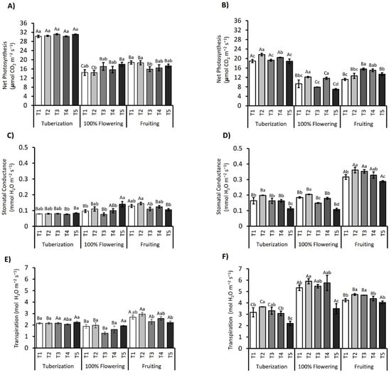Dynamics of net photosynthesis (Pn), stomatal conductance (gs), and transpiration rate (E) in the S. tuberosum var. Puyehue-INIA during the 2021/2022 (A,C,E) and 2022/2023 (B,D,F) growing seasons. Plants were subjected to five irrigation regimes: well-watered (T1, 100%), over-irrigated (T2, 130%), and deficit irrigation treatments (T3, 75%; T4, 50%; and T5, 30%). Measurements were taken at three phenological stages: tuberization, peak flowering, and fruiting. Bars represent the mean ± standard error (SE). Different capital letters indicate statistically significant differences between treatments across phenological stages, whereas lowercase letters indicate differences within each stage, according to Tukey’s HSD test (p ≤ 0.05).