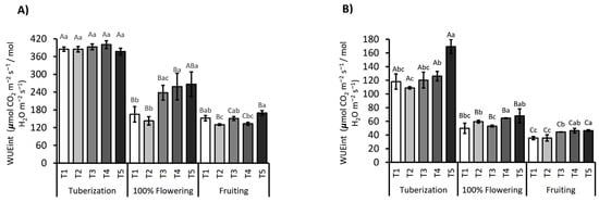Intrinsic water use efficiency (WUEint) in the S. tuberosum var. Puyehue-INIA during the 2021/2022 (A) and 2022/2023 (B) growing seasons. Plants were subjected to five irrigation regimes: well-watered (T1, 100%), over-irrigated (T2, 130%), and deficit irrigation treatments (T3, 75%; T4, 50%; and T5, 30%). Measurements were conducted at three phenological stages: tuberization, peak flowering, and fruiting. Bars represent the mean ± standard error (SE). The numbers above bars denote the percentage change in WUEint relative to the fully irrigated control (T1). Different capital letters indicate statistically significant differences between treatments across phenological stages, whereas lowercase letters indicate differences within each stage, according to Tukey’s HSD test (p ≤ 0.05).