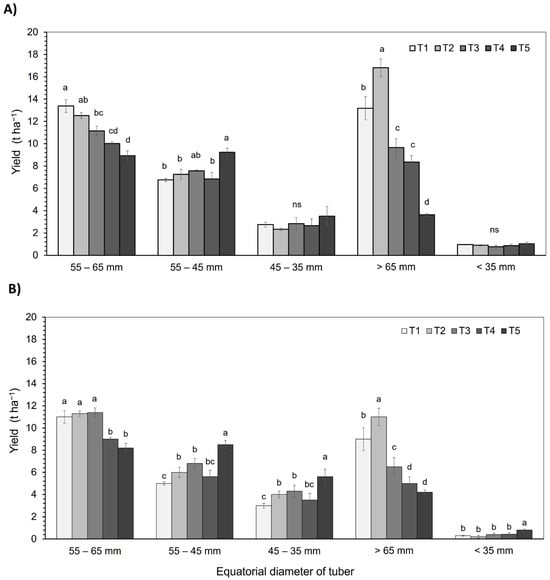 Yield (t ha−1) of the S. tuberosum var. Puyehue-INIA during the 2021–2022 (A) and 2022–2023 (B) growing seasons. Plants were subjected to five irrigation regimes: well-watered (T1, 100%), over-irrigated (T2, 130%), and deficit irrigation treatments (T3, 75%; T4, 50%; and T5, 30%). Yield was classified according to tuber equatorial diameter into commercial size (55–65 mm), seed category 1 (55–45 mm), seed category 2 (45–35 mm), larger than commercial size (>65 mm), and non-commercial size (<35 mm). Bars represent the mean ± standard error (SE). Different lowercase letters indicate statistically significant differences among treatments within the same size category according to Tukey’s HSD test (p ≤ 0.05).