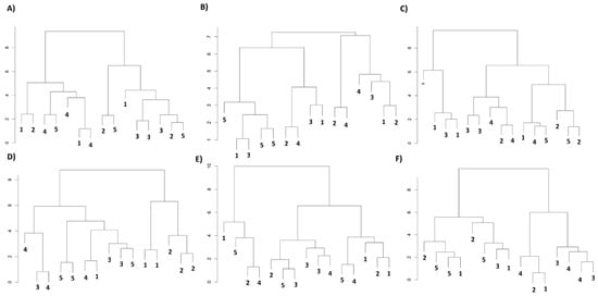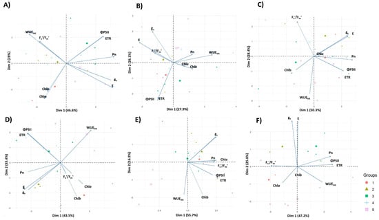 Treatment scores projected cleanly onto this framework. Well-watered and over-irrigated plots (T1, T2) clustered on the high-gs side of PC1, whereas moderate and severe deficits (T4, T5) migrated towards the WUEint/carotenoid quadrant; the intermediate treatment (T3) occupied an intermediate position. Superimposed phenological effects were evident; at flowering and fruit set, every treatment shifted downward along PC2, reflecting the universal decline in photochemical efficiency and chlorophyll content documented earlier. These patterns confirm that stomatal control was the primary axis of physiological divergence between irrigation regimes, while pigment adjustments and PSII tuning constituted a secondary, stage-driven layer of variability (Figure 6A–F).