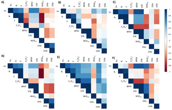 Correlation matrix of physiological parameters in the S. tuberosum var. Puyehue-INIA during the 2021/2022 (A–C) and 2022/2023 (D–F) growing seasons under different irrigation regimes: well-watered (T1, 100%), over-irrigated (T2, 130%), and deficit irrigation treatments (T3, 75%; T4, 50%; and T5, 30%). The heatmaps correspond to three phenological stages: tuberization (A,D), peak flowering (B,E), and fruiting (C,F). The color scale represents Pearson’s correlation coefficients between physiological variables, where dark blue indicates strong positive correlations, dark red indicates strong negative correlations, and lighter shades reflect weaker associations. The analyzed variables are net photosynthesis rate (Pn), stomatal conductance (gs), transpiration rate (E), quantum efficiency of photosystem II (ΦPSII), maximum photochemical efficiency (Fv’/Fm’), intrinsic water use efficiency (WUEint), electron transport rate (ETR), and chlorophyll content (Chla and Chlb).