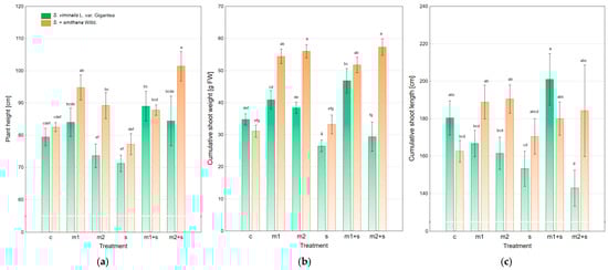 Biomass parameters of energy willow under different experimental treatments, (a) plant height; (b) cumulative shoot weight; (c) cumulative shoot length (c—control; m—application of a heavy metal mixture at lower (1) and higher (2) concentrations; s—salinity); mean ± standard error (n = 5). Different letters indicate significant differences between means according to Tukey’s HSD test at α = 95% for “variety × treatment” fixed effect.