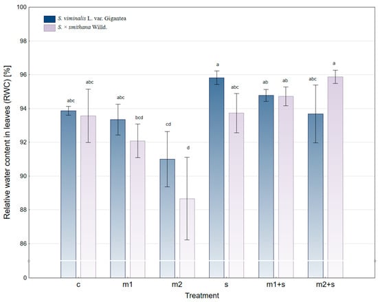 Relative water content (RWC) in leaves of energy willow under different experimental treatments (c—control; m—application of a heavy metal mixture at lower (1) and higher (2) concentrations; s—salinity); mean ± standard error (n = 5). Different letters indicate significant differences between means according to Tukey’s HSD test at α = 95% for “variety × treatment” fixed effect.