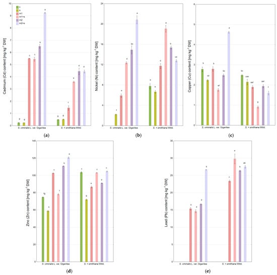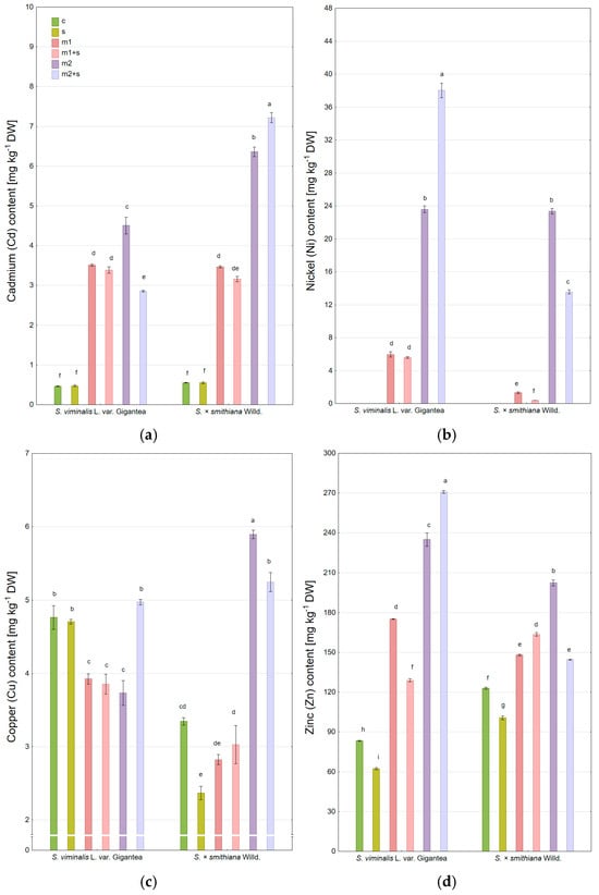 Similar patterns were observed for nickel (Ni), with the highest concentration also recorded in the m2+s variant (20.8 mg kg−1 DW for Gigantea), while Ni was undetectable in stems of control plants (Figure 4b). Across all treatments, the average Ni content in stems was comparable to that in leaves (10.8 vs. 9.3 mg kg−1 DW). Under the lower metal dose (m1), higher Ni accumulation was observed in S. × smithiana, whereas under the higher dose (m2), both varieties showed significantly higher and comparable Ni contents. In Gigantea, salinity further enhanced Ni uptake to stems, whereas in S. × smithiana, this effect was only observed at the lower Ni dose (m1); at the higher dose (m2), salinity actually reduced Ni content.
