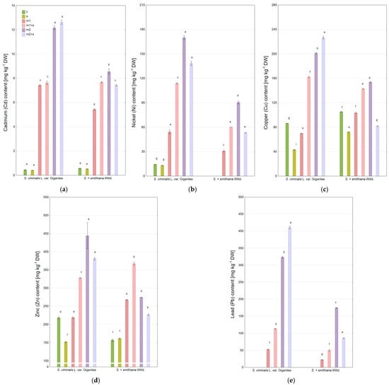 Heavy metal content in willow stems under experimental treatments, (a) cadmium (Cd); (b) nickel (Ni); (c) copper (Cu); (d) zinc (Zn); (e) lead (Pb) (c—control; m—addition of metal mixture at lower (1) and higher (2) levels; s—salinity). DW—dry weight; mean ± standard error (n = 3). Different letters indicate significant differences between means according to Tukey’s HSD test at α = 95% for “variety × treatment” fixed effect.
