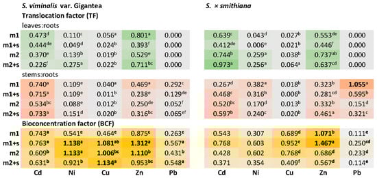 A heatmap presenting translocation factor (TF) and bioconcentration factor (BCF) values under experimental treatments (m—addition of metal mixture at lower (1) and higher (2) levels; s—salinity). Different letters indicate significant differences between means according to Tukey’s HSD test at α = 95% for “variety × treatment” fixed effect; values ≥1 indicated in bold.