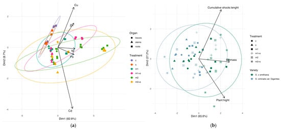 The second PCA analysis was performed to evaluate the variability of growth-related traits in willow varieties (Figure 7b). The first two principal components jointly accounted for 92.8% of the total variance, with contributions of 65.6% and 27.2%, respectively. The dim1 was influenced by all three measured traits, with biomass showing the strongest contribution, followed by plant height and cumulative shoot length. This indicates that dim1 reflects a general gradient of plant productivity. The dim2 was primarily associated positively with cumulative shoot length and negatively with plant height, suggesting that it represents differences in growth strategy between shoot elongation and the vertical growth of the main stem. The PCA results revealed moderate differentiation among the analyzed willow varieties. Samples of S. × smithiana were mainly clustered on the positive side of dim1, suggesting slightly higher overall productivity for this variety. Treatment effects were also evident, particularly in the metal-amended variants, which shifted sample positions toward higher dim1 values, indicating enhanced biomass production. In contrast, samples from the control and salinity treatments clustered closer to the origin of the coordinate system, revealing a limited growth response under these conditions.