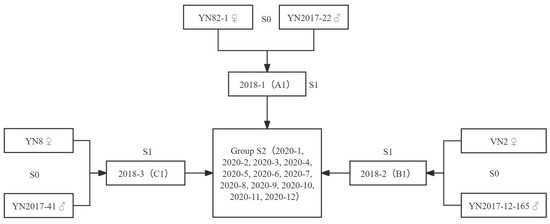 Subsequently, A1, B1, and C1 served as parents for further hybridization, obtaining 42 progenies from the cross A1 × B1, 41 from A1 × C1, 38 from B1 × A1, 24 from B1 × C1, 45 from C1 × A1, and 2 from C1 × B1. Figure 1 illustrates the pedigree chart detailing the parentage of the materials. The resulting S2 progeny, along with the original S0 and S1 materials, underwent field cultivation for further analysis.