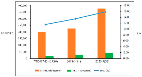 A comparative analysis of the elite germplasms across the breeding cycles (S0–S2) revealed progressive trait improvements (Table 5, Figure 2). The S2 selection 2020-7 demonstrated composite trait superiority, exhibiting 46.34% and 125.5% yield increments relative to the S1 (2018-1) and S0 (YN 2017-2-165), respectively. Notably, the S1 progenitor 2018-1 itself showed a 54.10% yield enhancement over the S0 baseline. The brix value of 2020-7 reached 15.90%, representing 2.38 and 4.35 percentage point increases compared to the S1 and S0 controls, with parallel improvements in the millable stalk density (89.02% and 67.08% over respective checks). Through polygene pyramiding of four S. spontaneum parents, 2020-7 achieved concurrent optimization of yield components (MSPH = 378,030 strip/hectare) and quality parameters. These findings collectively demonstrate that strategic parent aggregation in S2 generated synergistic genetic gains across multiple agronomic traits.