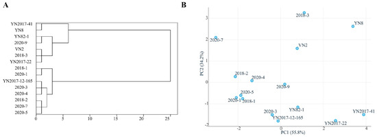 Hierarchical cluster analysis and principal component analysis of 15 materials from S0, S1, and S2 in Experiment 2. (A): cluster analysis; (B): principal component analysis.
