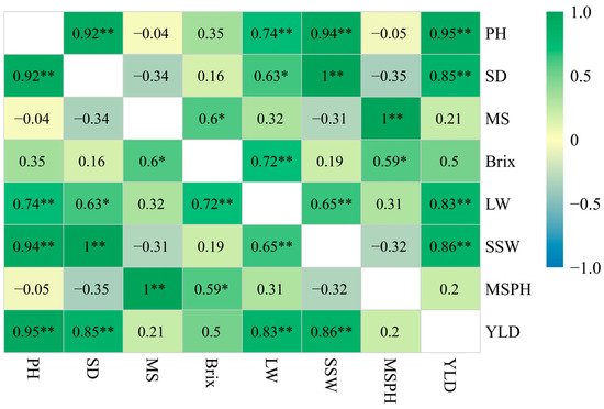The correlation analysis between key agronomic traits and yield in Experiment 2. Note: PH = plant height, SD = stalk diameter, MS = millable stalks, LW = leaf width, SSW = single stalk weight, MSPH = millable stalks per hectare, and YLD = yield per hectare. The degree of correlation is color-coded according to the color key on the right. The blue and red boxes indicate negative and positive correlation coefficients, respectively. The symbols * and ** indicate significance at 0.05 and 0.01 probability, respectively.