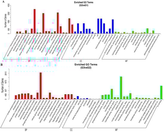 GO functional classification of DEGs. (A) G2 vs. G1. (B) G3 vs. G2. (C) G3 vs. G1.