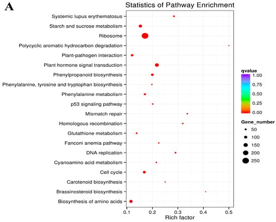 The different expression genes (DEGs) were estimated as fragments per kilo of the transcript base per million mapped reads (FPKM) [61,62]. Using the DESeq R package (1.10.1), differential expression analysis was carried out [63]. The GOseq R packages used Wallenius non-central hyper-geometric distribution to perform GO enrichment analysis of DEGs [64,65]. The online database called KEGG [66] is used to understand and to study the high-level uses and functions of biological systems (http://www.genome.jp/kegg/ (6 July 2024)). The KO-Based Annotation System 3.0 (KOBAS3.0) software was used to examine the statistical enrichment of the DEGs in KEGG pathways [67].