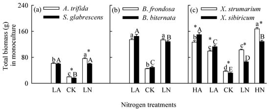 Total biomass of the invasive (open bars) and native (closed bars) species grown individually under different nitrogen forms and addition levels. CK, control; LA, low ammonium; LN, low nitrate; HA, high ammonium; HN, high nitrate. Panel (a), Ambrosia trifida vs. Siegesbeckia glabrescens; panel (b), Bidens frondosa vs. B. biternata; panel (c), Xanthium strumarium vs. X. sibiricum. Mean ± SE (n = 6). Different lower- and uppercase letters indicate significant differences among nitrogen treatments for the invasive and native species, respectively (p < 0.05; one-way ANOVA); * indicates significant difference between invasive and its related native species under the same nitrogen treatment (p < 0.05; independent samples t-test).