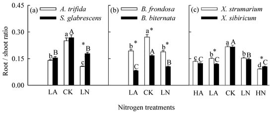 Root to shoot ratios of the invasive (open bars) and native (closed bars) species grown individually under different nitrogen forms and addition levels. CK, control; LA, low ammonium; LN, low nitrate; HA, high ammonium; HN, high nitrate. Panel (a), Ambrosia trifida vs. Siegesbeckia glabrescens; panel (b), Bidens frondosa vs. B. biternata; panel (c), Xanthium strumarium vs. X. sibiricum. Mean ± SE (n = 6). Different lower− and uppercase letters indicate significant differences among nitrogen treatments for the invasive and native species, respectively (p < 0.05; one-way ANOVA); * indicates significant difference between invasive and its related native species under the same nitrogen treatment (p < 0.05; independent samples t-test).