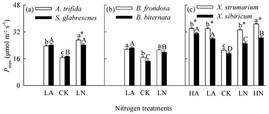 Light-saturated photosynthetic rates of the invasive (open bars) and native (closed bars) species grown individually under different nitrogen forms and addition levels. CK, control; LA, low ammonium addition; LN, low nitrate addition; HA, high ammonium addition; HN, high nitrate addition. Panel (a), Ambrosia trifida vs. Siegesbeckia glabrescens; panel (b), Bidens frondosa vs. B. biternata; panel (c), Xanthium strumarium vs. X. sibiricum. Mean ± SE (n = 6). Different lower− and uppercase letters indicate significant differences among nitrogen treatments for the invasive and native species (p < 0.05; one-way ANOVA); * indicates significant difference between invasive and its related native species under the same nitrogen treatment (p < 0.05; independent samples t-test).