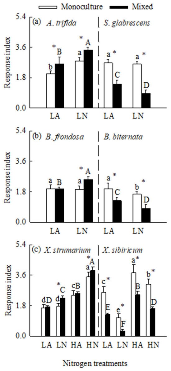 Response indices to different nitrogen forms and addition levels of the invasive and native species grown without (open bars) and with (closed bars) competition. LA, low ammonium; LN, low nitrate; HA, high ammonium; HN, high nitrate. Panel (a), Ambrosia trifida vs. Siegesbeckia glabrescens; panel (b), Bidens frondosa vs. B. biternata; panel (c), Xanthium strumarium vs. X. sibiricum. Mean ± SE (n = 6). Different lower− and uppercase letters indicate significant differences among the invasive and its related native species grown under different nitrogen treatments in the conditions without and with competition, respectively (p < 0.05; one-way ANOVA); * indicates significant difference between mixed and monoculture for the invasive (left) and native (right) species grown under the same nitrogen treatment (p < 0.05; independent samples t-test).