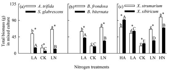 Total biomass of the invasive (open bars) and native (closed bars) species grown under different nitrogen forms and addition levels in mixed culture. CK, control; LA, low ammonium; LN, low nitrate; HA, high ammonium; HN, high nitrate. Panel (a), Ambrosia trifida vs. Siegesbeckia glabrescens; panel (b), Bidens frondosa vs. B. biternata; panel (c), Xanthium strumarium vs. X. sibiricum. Mean ± SE (n = 6). Different lower- and uppercase letters indicate significant differences among nitrogen treatments for the invasive and native species, respectively (p < 0.05; one-way ANOVA); * indicates significant difference between invasive and its related native species under the same nitrogen treatment (p < 0.05; independent samples t-test).
