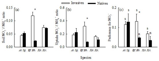 The ratios of nitrate nitrogen to ammonium nitrogen in soils (a), the ratios of nitrate nitrogen to ammonium nitrogen absorbed by roots (b), and the preference indices for nitrate (c) in the invasive (open bars) and native (closed bars) species. At., Ambrosia trifida; Sg., Sigesbeckia glabrescens; Bf., Bidens frondosa; Bt., B. biternata; Xst., Xanthium strumarium; Xsi., X. sibiricum. Mean ± SE (n = 5 for panel a; n = 3 for panels (b,c)). * indicates significant difference between invasive and its related native species (p < 0.05; independent samples t-test); s and n in panel (c) indicate that the preference were significant and non-significant (p < 0.05; independent samples t-test), respectively.