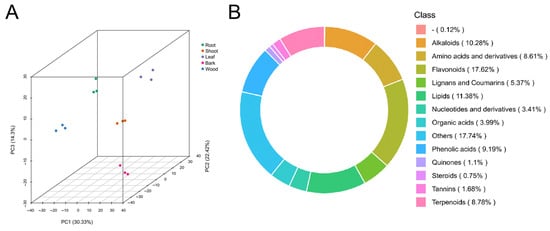 Summary of metabolome. (A) The principal component analysis of metabolome data from the 15 samples. (B) Class-count ring of metabolome data. “-” represents unknown metabolites.