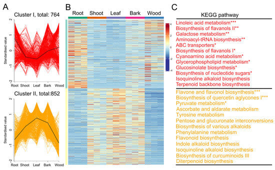 The differentially accumulated metabolites (DAMs) among five tissues. (A) K-means analysis of DAMs. (B) A heatmap of DAMs. (C) Kyoto Encyclopedia of Genes and Genomes enrichment analysis of DAMs. “*” indicates a significant difference of p < 0.05. “**” indicates a significant difference of p < 0.01. “***” indicates a significant difference of p < 0.001.