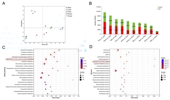 Based on transcripts per million (TPM) values, gene expression patterns were analyzed across different tissues (Table S4). A total of 13,325 genes were found to be differentially expressed (DEGs) in at least one of the pairwise comparisons, including root/leaf, wood/leaf, bark/leaf, root/shoot, wood/root, wood/shoot, bark/wood, bark/root, shoot/leaf, and bark/shoot. The numbers of upregulated and down-regulated genes in each comparison are presented in Figure 3B.