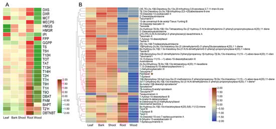 Integrated metabolomic and transcriptomic analysis of paclitaxel biosynthesis. (A) Differential expression of genes involved in paclitaxel biosynthesis from the five tissues. (B) Differential accumulation of taxoids from the five tissues.