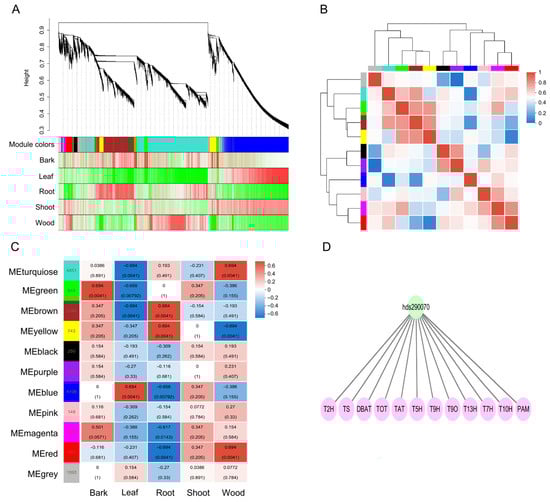 WGCNA of 13,352 DEGs. (A) Gene dendrogram and module colors in blocks. (B) Correlation between modules. (C) Correlations between modules and samples. (D) Regulatory network involved in paclitaxel biosynthesis.