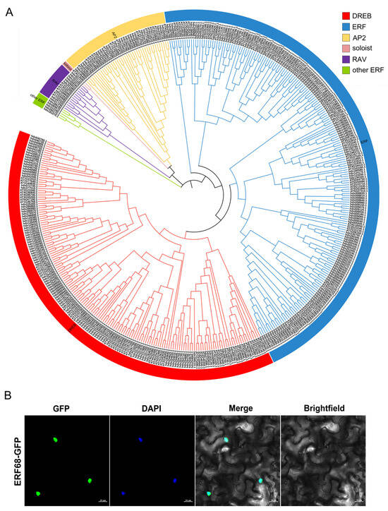 Phylogenetic analysis of AP2/ERF family genes in the T. wallichiana genome and subcellular localization assay of ERF68. (A) The phylogenetic tree of AP2/ERF transcription factors in T. wallichiana. (B) Subcellular localization of ERF68.
