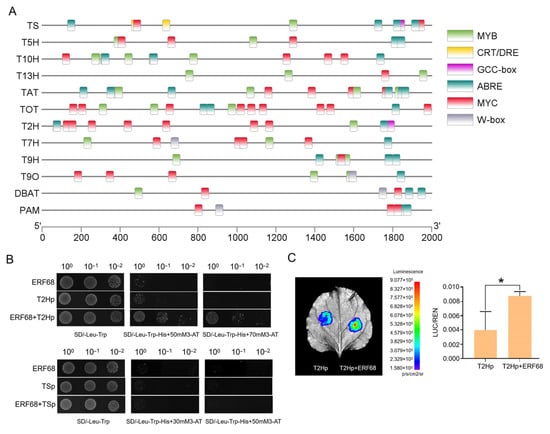 ERF68 regulates the expression of T2H. (A) Screening of TF-binding elements in the promoter regions of TS, T5H, T13H, T10H, TAT, T2H, T7H, T9H, T9O, DBAT, and PAM genes. (B) Yeast one-hybrid assay analysis of the interaction between ERF68 and the promoters of T2H and TS. (C) Dual-luciferase assays in tobacco leaves show that ERF68 activates the promoter activity of T2H. Each value is the mean ± SD of three biological repeats. “*” indicates a significant difference of p < 0.05.