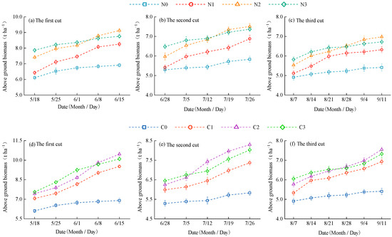 The dynamic accumulation of aboveground biomass of alfalfa. (a–c) show changes in aboveground biomass of alfalfa plants with urea application; (d–f) show changes in the aboveground biomass of alfalfa plants with CRU application.