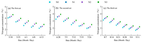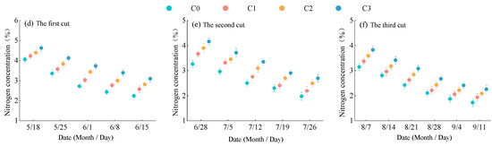 Changes in nitrogen concentration in alfalfa plants at different stages of growth. (a–c) show the changes in nitrogen concentration of alfalfa plants with urea application; (d–f) show the changes in nitrogen concentration of alfalfa plants with CRU application.