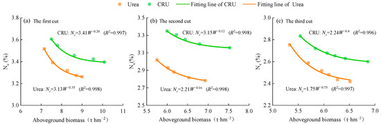 Critical nitrogen dilution curve models were separately constructed for the aboveground biomass of alfalfa under urea and CRU treatments across the three cuts (Figure 3). The models showed excellent fit, with all coefficients of determination (R2) exceeding 0.99, indicating that the established models effectively described the relationship between aboveground biomass and critical nitrogen concentration. For the CRU treatments, the parameter a values for the first, second, and third cuts were 3.41, 3.15, and 2.24, respectively, all higher than those under urea treatments (3.13, 2.21, and 1.75). This suggests that CRU improved the nitrogen uptake capacity in alfalfa plants compared to urea. In contrast, the b values under CRU treatment (0.20, 0.12, and 0.40) were lower than those under urea (0.35, 0.16, and 0.73), indicating that nitrogen concentration in alfalfa plants decreased more slowly with biomass accumulation under CRU than under urea, i.e., a slower nitrogen dilution rate.
