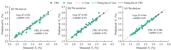 The critical nitrogen dilution models constructed in 2023 were validated using experimental data from the 2024 growing season. During the 2024 season, the maximum aboveground biomass of alfalfa under urea treatment for the first, second, and third cuts ranged from 6.9 to 8.4 t·ha−1, 5.7 to 6.9 t·ha−1, and 5.3 to 6.4 t·ha−1, respectively. Under CRU treatment, the maximum aboveground biomass for the three cuts ranged from 7.0 to 9.3 t·ha−1, 5.9 to 7.5 t·ha−1, and 5.5 to 6.9 t·ha−1, respectively. These maximum biomass values were substituted into the respective critical nitrogen dilution equations to calculate the simulated critical nitrogen concentrations. The simulated values were then compared with measured values through regression analysis (Figure 4). The resulting coefficients of determination (R2) ranged from 0.96 to 0.99, and the normalized root mean square error (n-RMSE) ranged from 3.1 to 13%. These results indicate that the critical nitrogen dilution models for alfalfa under both urea and CRU treatments exhibit high stability and accuracy.