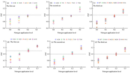 Dynamic changes in the NNI of alfalfa plants under different nitrogen fertilizer management. (a–c) show the changes in NNI of alfalfa plants with urea application; (d–f) show the changes in NNI of alfalfa plants with CRU application.