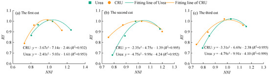 To further evaluate the feasibility of using the NNI to predict nitrogen surplus or deficiency in alfalfa plants, the relationship between NNI and relative yield (RY) was established (Figure 6). The coefficients of determination (R2) under both urea and CRU treatments reached highly significant levels, indicating a strong fit between NNI and RY and suggesting that NNI can be effectively used to predict nitrogen nutritional status in alfalfa. In addition, the NNI values corresponding to maximum RY under urea treatment were higher than those under CRU treatment, indicating that higher nitrogen application is required to achieve maximum yield when using urea compared to CRU.
