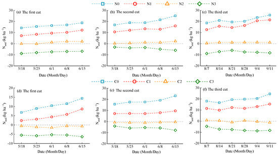 The dynamic changes in Nand of alfalfa plants. (a–c) show the changes in Nand of alfalfa plants with urea application; (d–f) show the changes in Nand of alfalfa plants with CRU application.