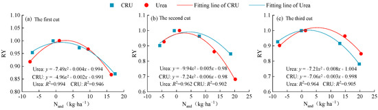 Similar to NNI, the relationship between Nand and RY was established (Figure 8, p < 0.05). The coefficients of determination (R2) for both urea and CRU treatments were high, ranging from 0.902~0.994, indicating that the model effectively explains the relationship between Nand and RY. The quadratic term coefficient in the fitted curve reflects the sensitivity of alfalfa yield to nitrogen deficit. The absolute value of the quadratic coefficient under urea treatment was greater than that under CRU treatment, suggesting that yield in urea-treated alfalfa is more sensitive to nitrogen deficit fluctuations and thus requires more precise nitrogen management.