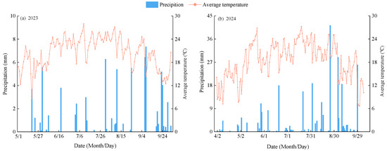 The experiment was conducted from April to October in both 2023 and 2024 at the Irrigation Experiment Station of the Jingtai Chuan Electricity-Lift Irrigation Water Resources Utilization Center, Gansu Province (37°23′ N, 104°08′ E; elevation 2028 m). The long-term average annual precipitation, evaporation, sunshine duration, mean radiation, mean air temperature, and frost-free period at the site are 191.6 mm, 2761 mm, 2652 h, 6.18 × 105 J·cm−2, 8.5 °C, and 191 days, respectively. The soil at the experimental site is classified as sandy loam, with a bulk density of 1.45 g·cm−3, a maximum field water-holding capacity of 24.1% (gravimetric basis), and a pH of 8.11. In the 0–20 cm topsoil layer, the contents of soil organic matter, total nitrogen, total phosphorus, total potassium, available nitrogen, and available phosphorus were 6.09 g·kg−1, 1.62 g·kg−1, 1.32 g·kg−1, 34.03 g·kg−1, 74.51 mg·kg−1, and 26.31 mg·kg−1, respectively. During the alfalfa growing period in 2023, the average precipitation and temperature were 0.51 mm and 20.58 °C, respectively, while in 2024, they were 0.99 mm and 12.28 °C (Figure 9).